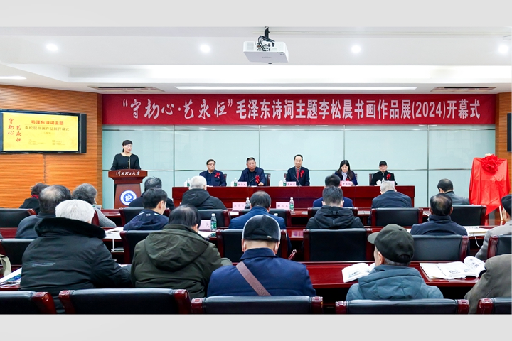 赓续红色血脉,奉献当代社会。12月23日上午,由我校和中国收藏家协会等单位共同主办的“守初心 艺永恒”毛泽东诗词主题李松晨书画作品展(2024)在南校区明德楼三楼公共艺术展厅开幕。活动开幕式在明德楼一楼会议室举行。