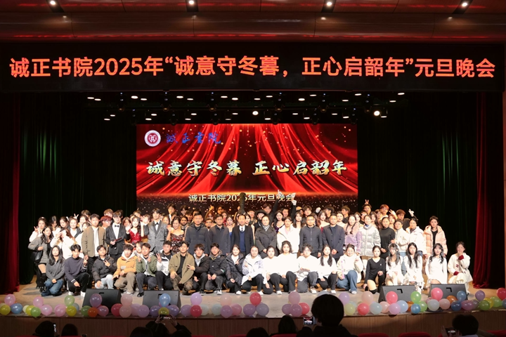 岁月轮回迎新岁,灵蛇献瑞展宏图。12月26日晚,诚正书院2025年“诚意守冬暮,正心启韶年”元旦晚会于南校区小礼堂举行。校办、党委宣传部、党委统战部、学生工作部(处)、校团委、教务处、研究生工作部(处)、国际合作交流处、保卫部(处)、后勤保障处等职能部门,测绘学院、材料学院、土木学院、计算机学院、工商学院、数信学院、化工学院、建艺学院、文法学院、利莫瑞克国际学院等相关负责人,以及诚正书院领导班子成员、师生代表共700余人参加晚会。