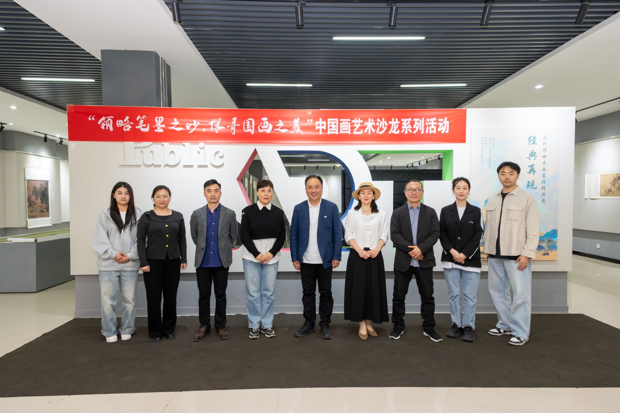 孙娟首先从“提升政治站位,健全组织机构,完善规章制度”“突出课程建设,丰富实践活动,凸显品牌特色”“加强师资建设,充实财力物力,提供条件保障”三方面对近几年中心的工作进行了详细介绍与总结。之后前往明德楼三楼公共艺术展览馆进行了实地考察,观赏了我校正在举办的艺术沙龙活动。