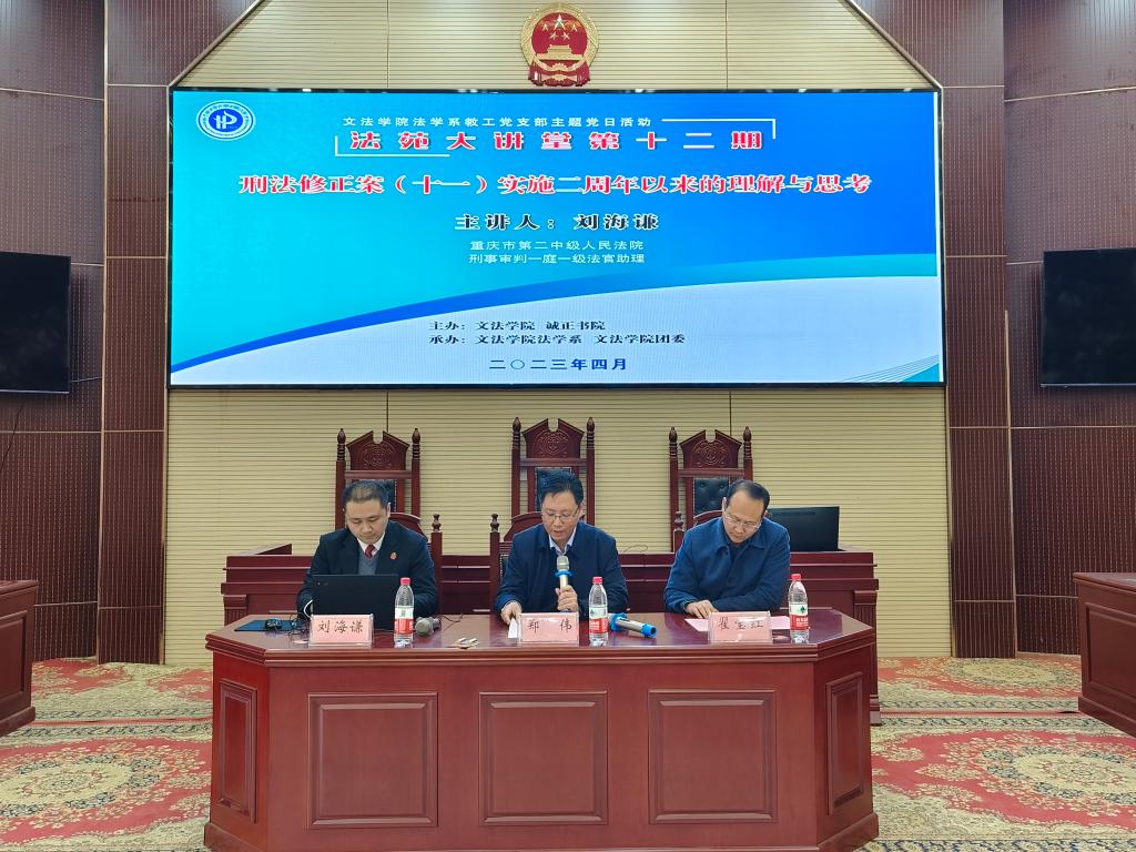 为深入学习宣传贯彻习近平法治思想,落实中共中央办公厅、国务院办公厅印发的《关于加强新时代法学教育和法学理论研究的意见》文件精神,切实提升学生的综合素质与专业水平,4月4日下午,诚正书院联合文法学院在北校区模拟法庭举办优秀校友司法实务暨就业指导讲座,文法学院法学2008届优秀校友、重庆市第二中级人民法院刑一庭刘海谦法官为本次讲座的主讲人,法学专业各年级同学参加了本次讲座。