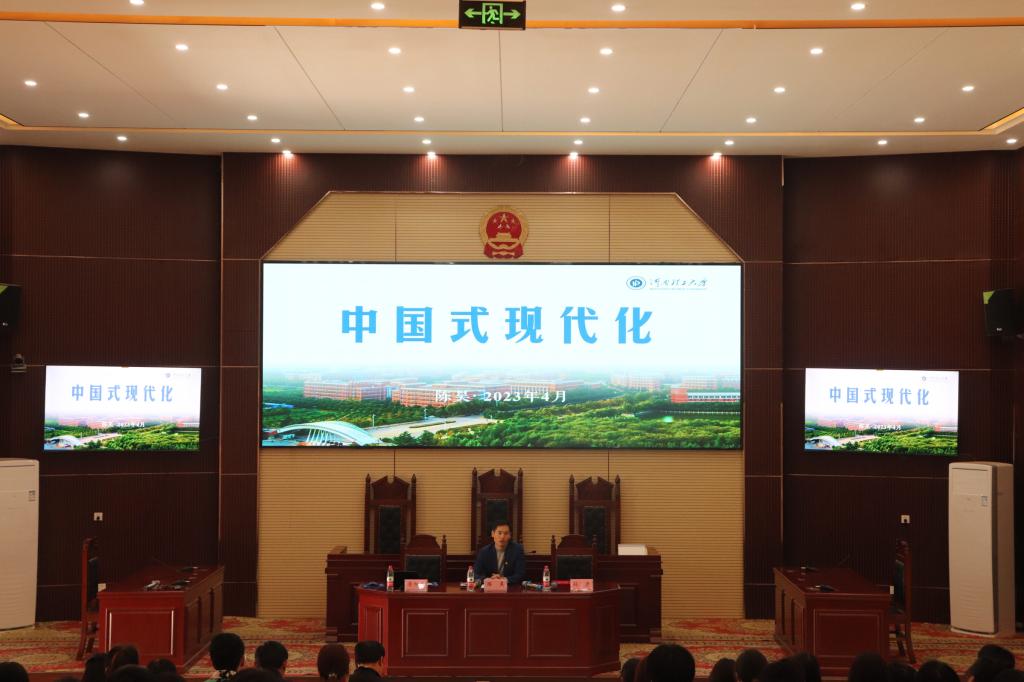 陈昊以《中国式现代化》为题,从习近平新时代中国特色社会主义思想的发展历程出发,围绕“一个中心任务”“五项基本特征”“摒弃四种老路”“九个必须坚持”“两个永远在路上”五个方面,对中国式现代化进行了系统阐释和深入解读。他指出,中国式现代化是中国共产党领导的社会主义现代化,开辟了属于中国但又具有世界意义的现代化道路,创造了全新的人类文明形态。他强调,推进中国式现代化需要构筑中国精神,尤其我们身边就有“亲民爱民、艰苦奋斗、科学求实、迎难而上、无私奉献”的焦裕禄精神和“自力更生、艰苦创业、团结协作、无私奉献”的红旗渠精神,广大同学要好好利用良好条件,增强自身本领,提升思想素养和政治品格,为推动中国式现代化和中华民族伟大复兴做出应有贡献。