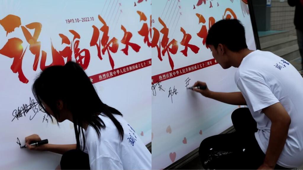 9月30日下午,签名活动拉开序幕,同学们热情高涨,积极参与,纷纷写下了自己对祖国的美好祝愿。有的人写道:“欣逢盛世华诞,愿山河无恙,祖国繁荣昌盛”,也有的人写道:“愿以寸心寄华夏,且将岁月赠山河”“愿国家富强,民族复兴,人民幸福”“此生无悔入华夏,来世还做中国人”“生在红旗下,长在春风里,祖国永远昌盛”“祖国万岁,生日快乐”……一句句慷慨激昂的文字就是他们为祖国送上的真挚祝福。