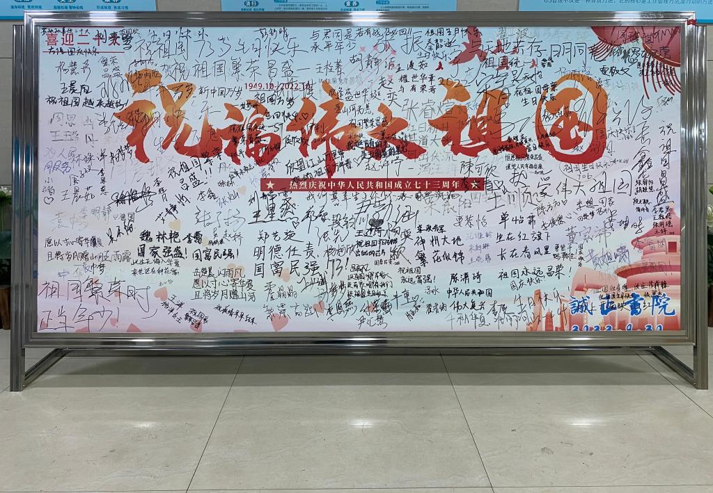为进一步弘扬社会主义核心价值观,在师生中营造爱党、爱国、奋发向上的工作和学习氛围,在中华人民共和国成立73周年到来之际,诚正书院师生在书院楼前开展“祝福伟大祖国”签名活动。