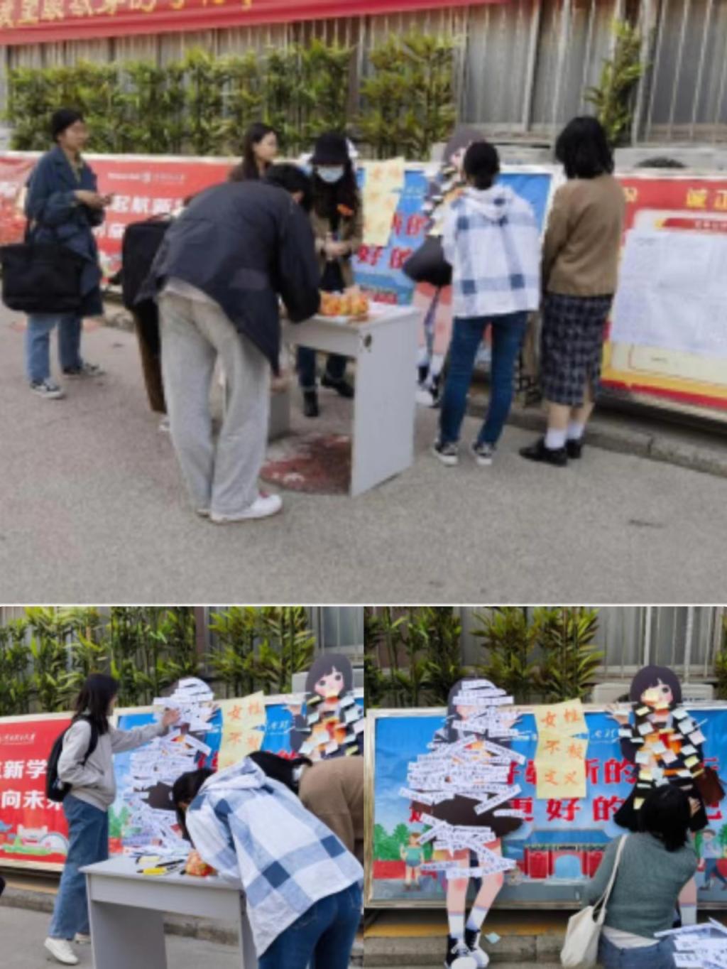 活动现场,同学们可以看到身上被贴满各种各样的标签的女孩人形立牌,标签上写满了对女性的定义与看法,路过的同学驻足观看并沉思。片刻后,开始有人帮女孩撕掉了身上的标签,同时写下了对贴满标签的女孩的鼓励。同学们面对充满意义的活动,不少人自发拍照、拍视频来宣传。同学们撕掉的不仅仅是女孩身上的标签,更是这一个个标签背后的偏见、枷锁与深渊。没有人可以定义别人的人生,除了她们自己,希望每一位女性都能在自己的人生赛道绽放属于自己独一份的精彩。