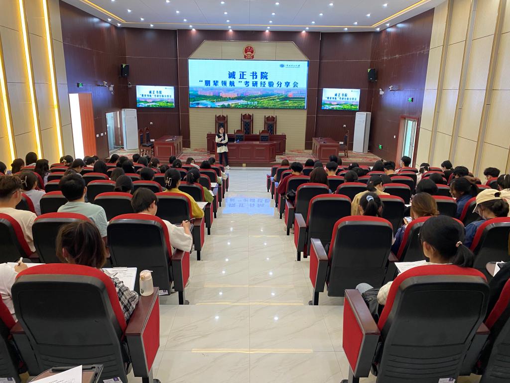为进一步激发广大书院学子的考研热情,树立考研目标,掌握备考技巧,5月10日下午3点,诚正书院于模拟法庭举办“朋辈领航”的考研经验分享会。参加分享会的有诚正书院党委书记、院长孙彦,全体辅导员,6位考取研究生的2023届优秀毕业生代表,以及学生代表300余人参加了此次会议。