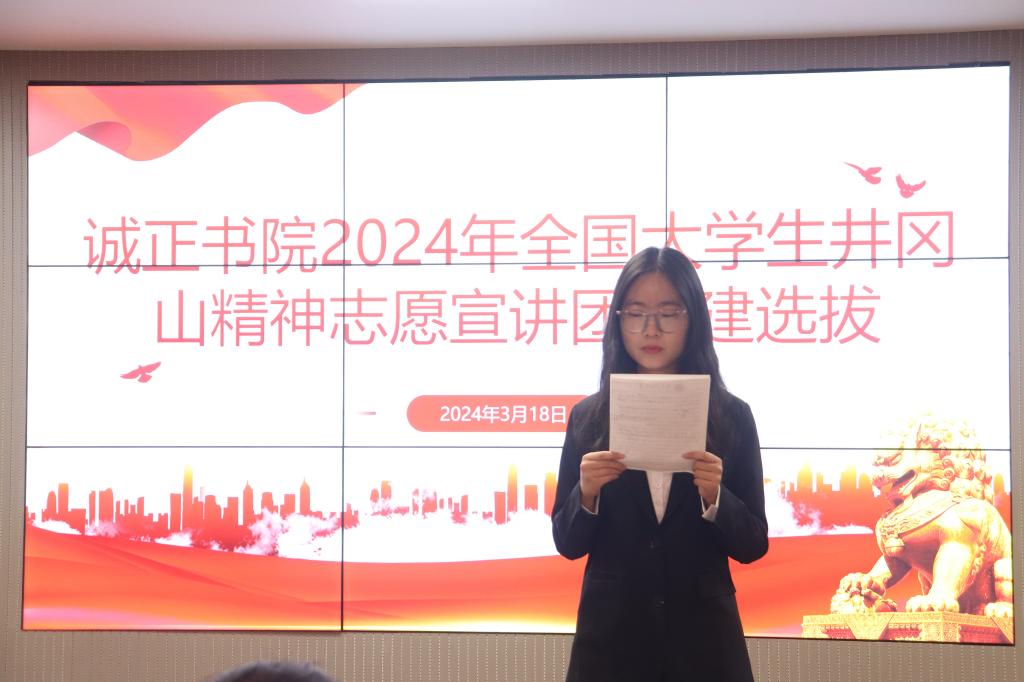 为深入学习贯彻习近平新时代中国特色社会主义思想和党的二十大精神,落实“强国复兴有我”群众性主题宣传教育活动要求,团中央青年志愿者行动指导中心、全国青少年井冈山革命传统教育基地管理中心联合发起的2024年全国大学生井冈山精神志愿宣讲活动。诚正书院积极响应号召,3月17日于诚正书院多功能会议室开展了“井岗咏叹,星火相传”宣讲团选拔活动,旨在选拔出一批优秀的青年学子,成为传承和弘扬井冈山精神的生力军。