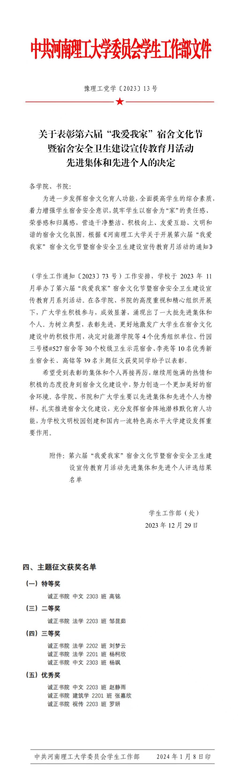为进一步发挥宿舍文化育人功能,全面提高学生的综合素质,筑牢学生以宿舍为“家”的责任感、荣誉感和归属感,营造干净整洁、积极向上、友爱互助、文明和谐的宿舍文化氛围,根据《诚正书院第六届 “我爱我家”宿舍文化主题征文活动通知》安排,2023年11月书院通过电子投稿征集的方式向书院学生征集相关文章。