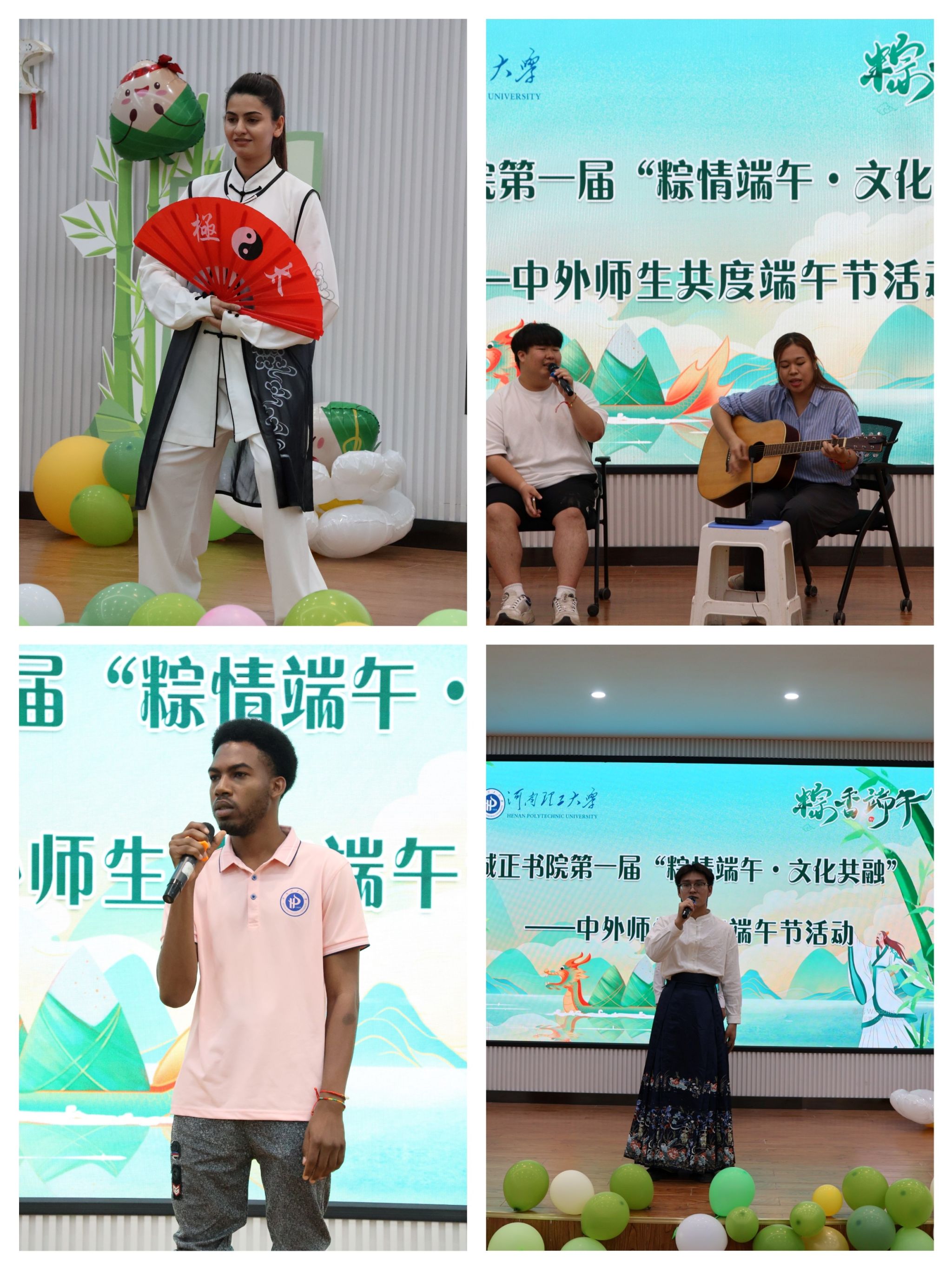 讲话完毕,精彩的节目陆续登场,中外师生准备了精彩的独具本国特色的节目,如:舞蹈、歌曲、朗诵等,充分展示了多元文化交融的魅力。中外学生共同体验包粽子的乐趣后,又体验了长筷夹粽、趣味投壶、击鼓传粽等传统活动的乐趣,参与的师生个个喜笑颜开,相互鼓励,满怀希望、祝福和感恩,现场充满了欢声笑语和温馨的氛围。