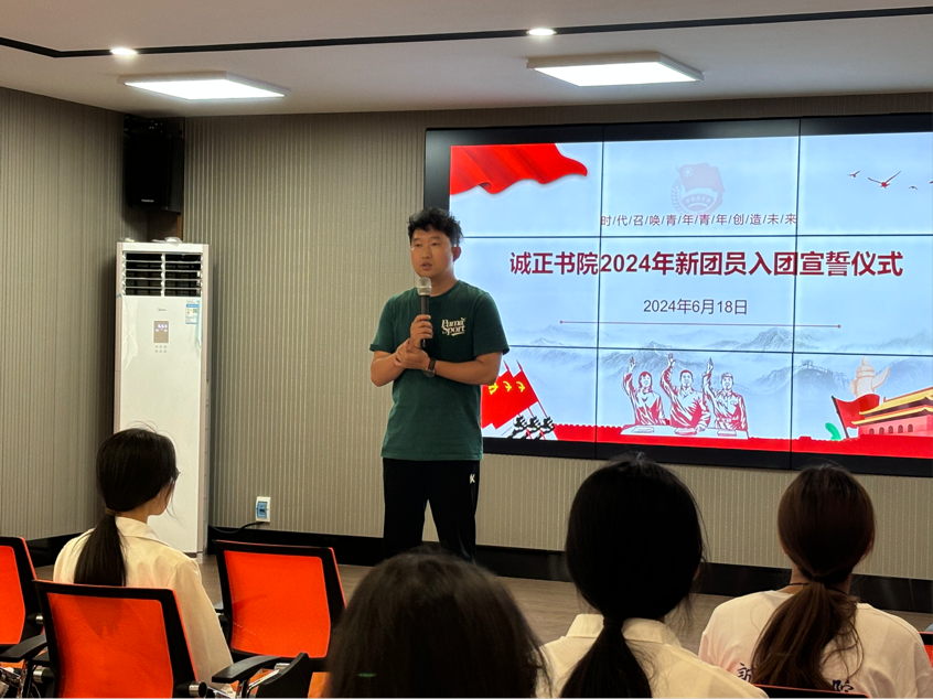 为进一步规范书院共青团工作,按照书院党委和上级团组织的工作要求,6月18日,诚正书院团委在书院多功能室116隆重举行2024年新团员入团宣誓仪式,院团委负责人李雪峰和全体43名新团员参加了入团仪式。