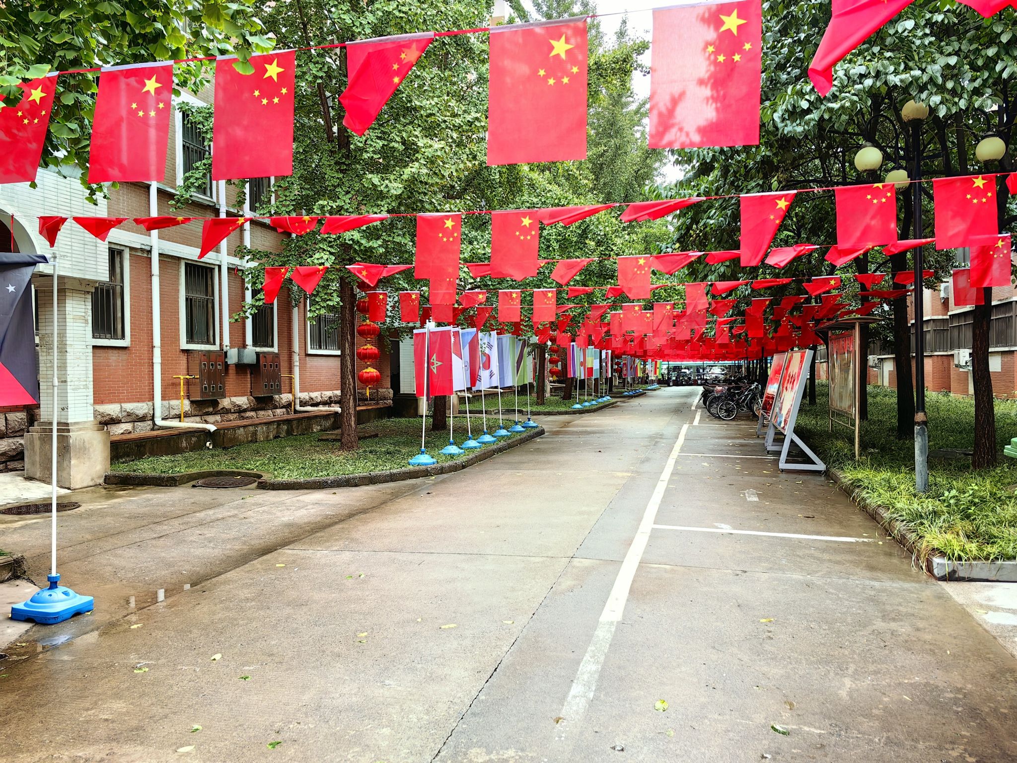 最为引人注目的,莫过于庭院中精心布置的一排排鲜艳的五星国旗。在蓝天白云的映衬下,一面面五星红旗迎风招展,它们不仅代表着祖国的繁荣昌盛,更激发了每一位学生的爱国情怀和民族自豪感。尤为特别的是,为了体现留学生群体的多元性,推动留学生与中国学生的管理趋同化,除了中国国旗外,还特意布置了来自26个不同国家的国旗,这些国旗与五星红旗交相辉映,共同编织出一幅色彩斑斓的国际友谊画卷。