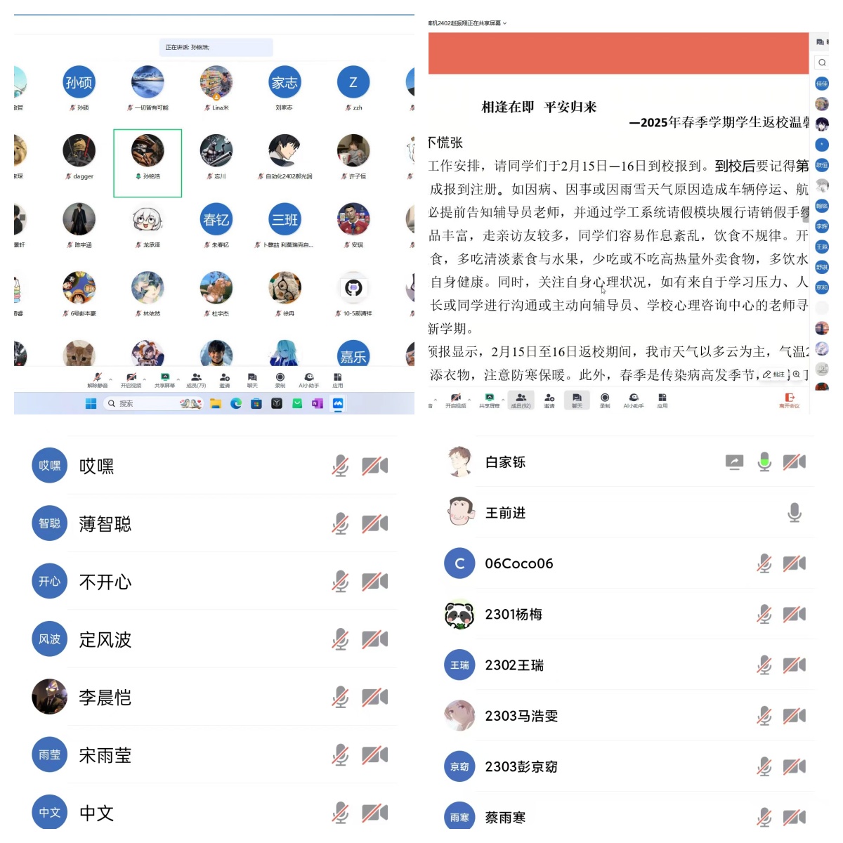 随着2025年春季学期的临近,为确保每位学生都能安全、顺利地返回校园,书院高度重视学生安全教育工作,精心组织了一系列线上主题班会,旨在通过提前预防、全面提醒的方式,为学生返校前后的安全保驾护航。