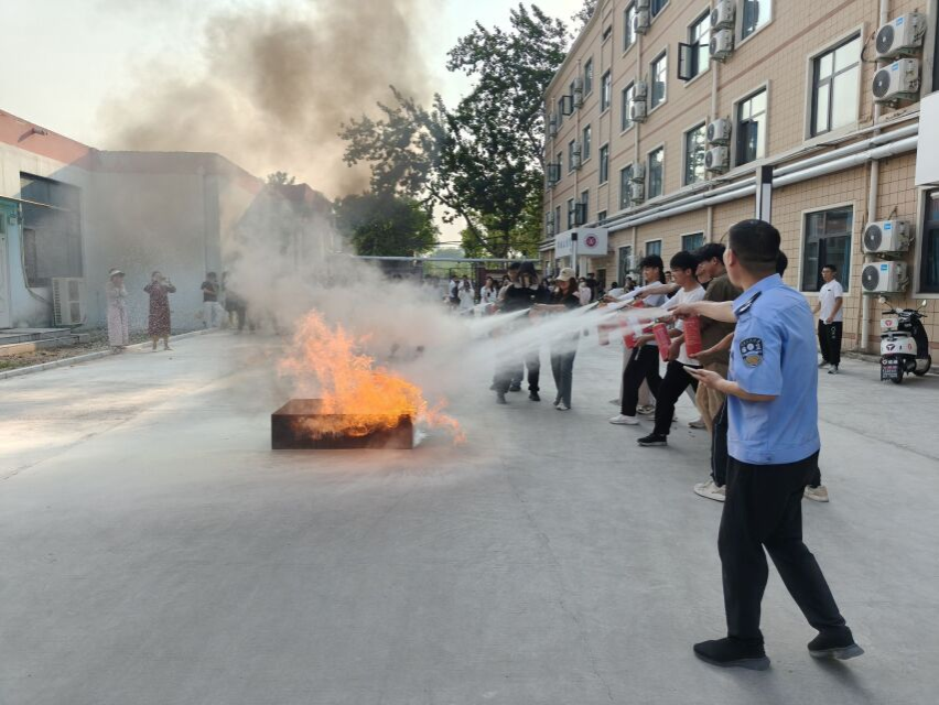 演练分为理论讲解、实操演练和疏散逃生三个环节。保卫处老师详细讲解灭火器使用方法并示范操作,学生代表进行实战演练,掌握"提、拔、握、压"操作要领。随后,模拟火灾警报拉响,师生迅速用湿毛巾捂住口鼻,低姿沿疏散路线撤离至安全区域,过程快速有序。