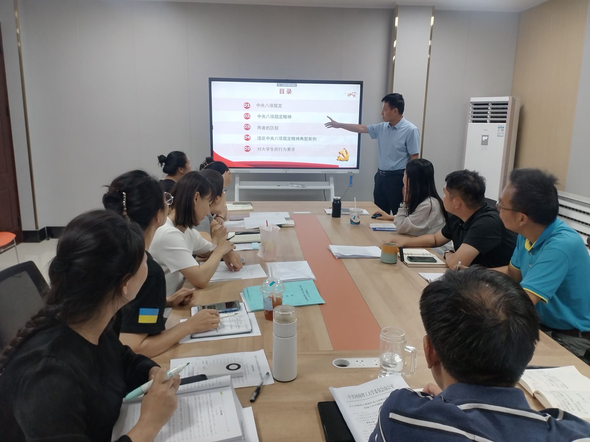 李旭升强调,全体教职工党员要以高度的政治自觉,严格遵守中央八项规定精神。在日常工作中,要从细节入手,从自身做起,坚决杜绝形式主义、官僚主义、享乐主义和奢靡之风。他鼓励党员们积极发挥先锋模范作用,以实际行动践行党的优良作风,为书院的发展贡献自己的力量。