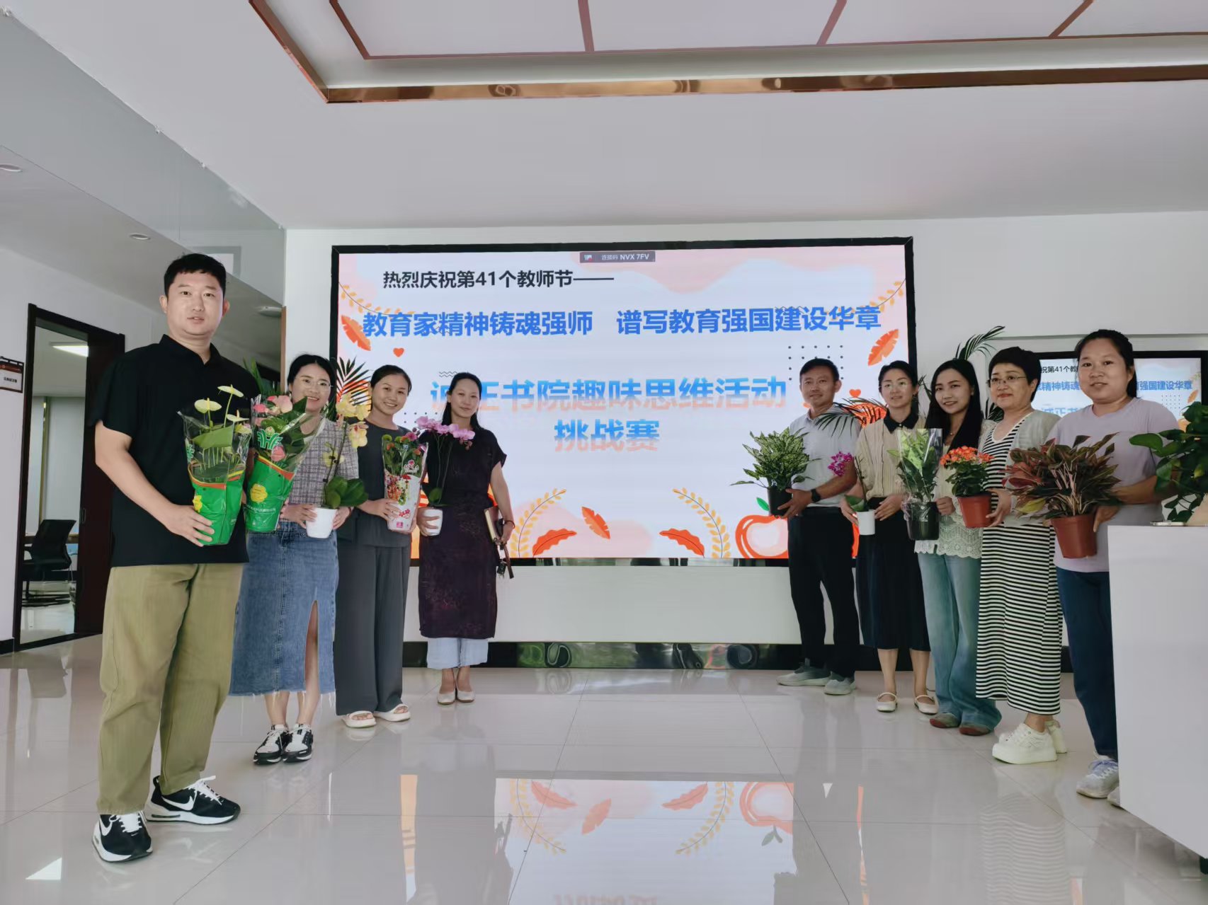 本次活动融合“趣味”与“挑战”,设置“你画我猜”“过目不忘”及“看图猜成语”等环节,集知识性、趣味性、协作性于一体。现场气氛热烈,欢笑声此起彼伏,充分展现了教师们活力洋溢、团结协作的风采。活动结束后,书院工会为老师们送上精心挑选的绿植盆栽,希望老师们在绿意中舒缓压力、放松身心,以更加饱满的精神状态投入到教育事业当中。最后,本次活动在全体教职工温馨合影留念中圆满落下帷幕。