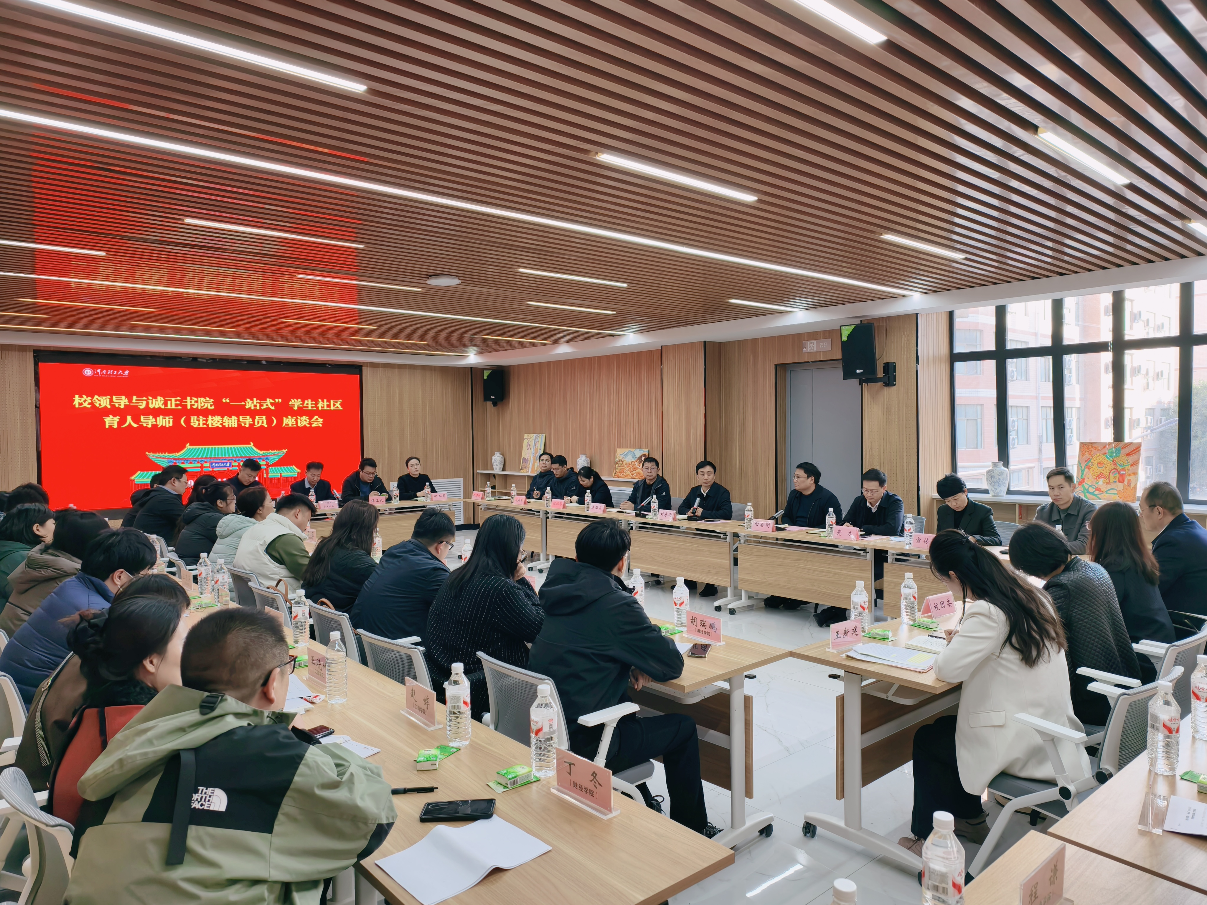 党办、组织部、宣传部、统战部、学生处、人事处、财务处、研工部、后勤部、保卫处、校团委等相关职能部门负责人,“一站式”学生社区工作人员和全体育人导师(驻楼辅导员)参加座谈会。
