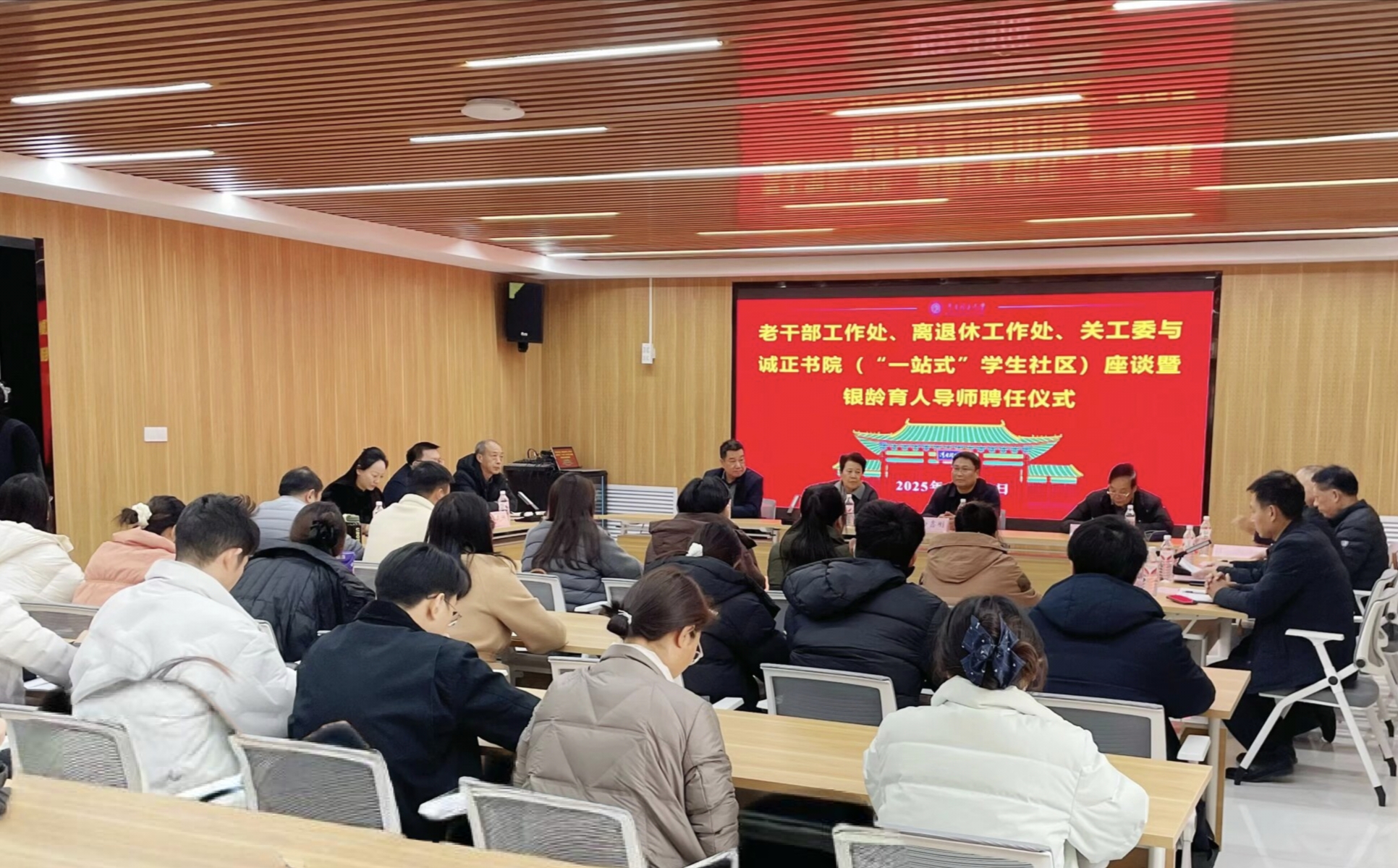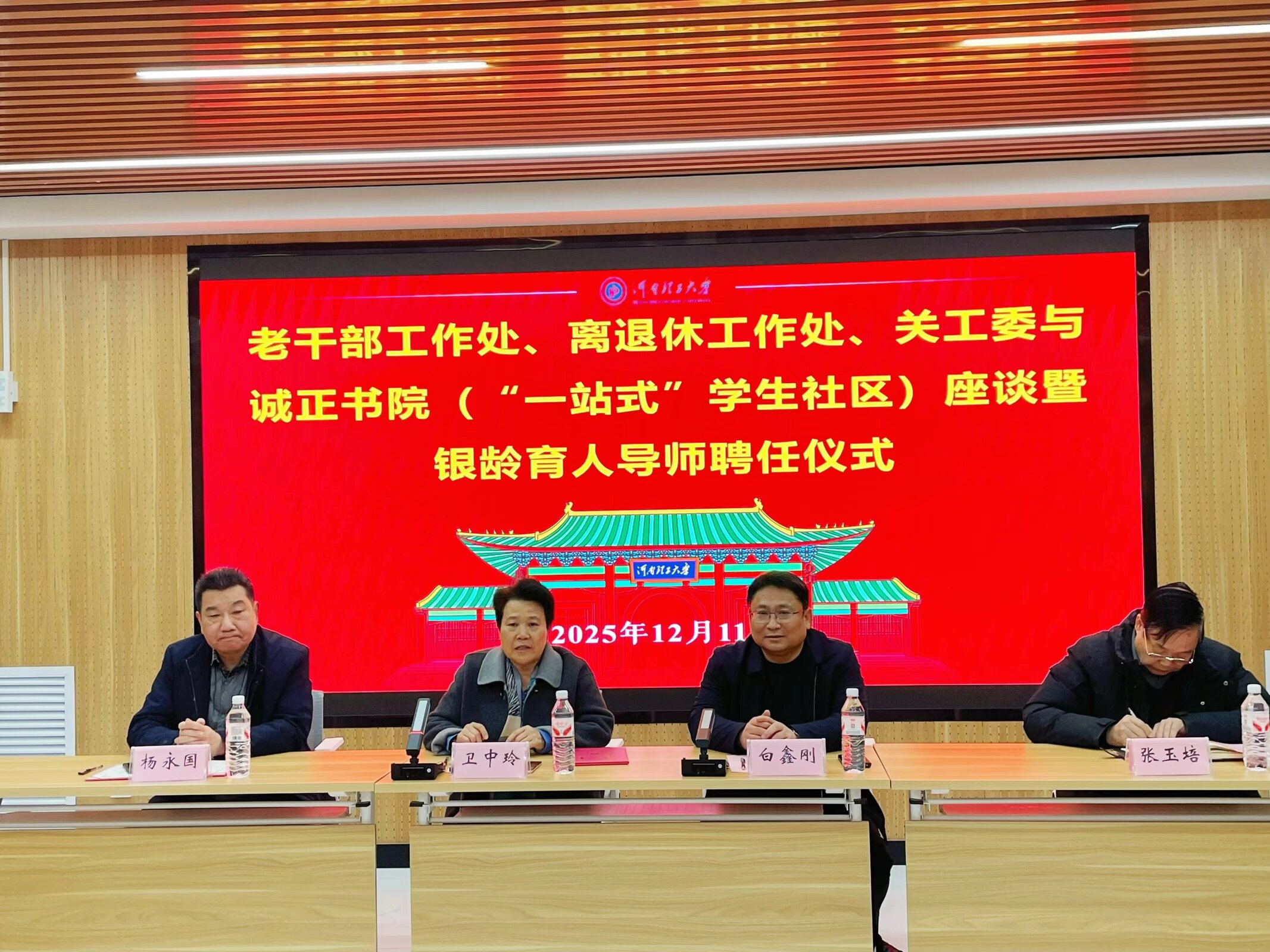 12月11日下午,老干部处、离退休工作处、关工委与诚正书院(“一站式”学生社区)座谈暨银龄育人导师聘任仪式在诚正书院二楼会议室顺利举行。校党委副书记白鑫刚、关工委常务副主任、原校党委副书记卫中玲、关工委“五老”专职委员张玉培、杨永国、张国成、朱天明、邵强应邀出席,离退休工作处处长王建洲、社区相关负责人、育人导师、科室负责人及学生代表共同参加。