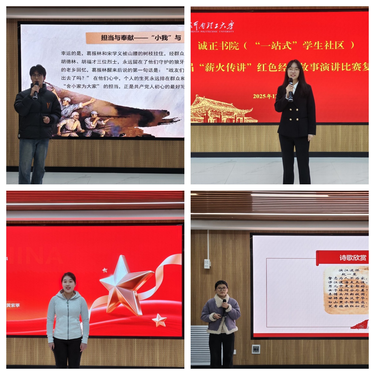 12月24日晚,诚正书院(“一站式”学生社区)成功举办“薪火传讲”红色经典故事演讲比赛复赛。共有18名选手同台竞技,以深情讲述和精彩演绎,带领观众重温英烈事迹,传承红色精神,呈现了一场感人至深的思想洗礼。