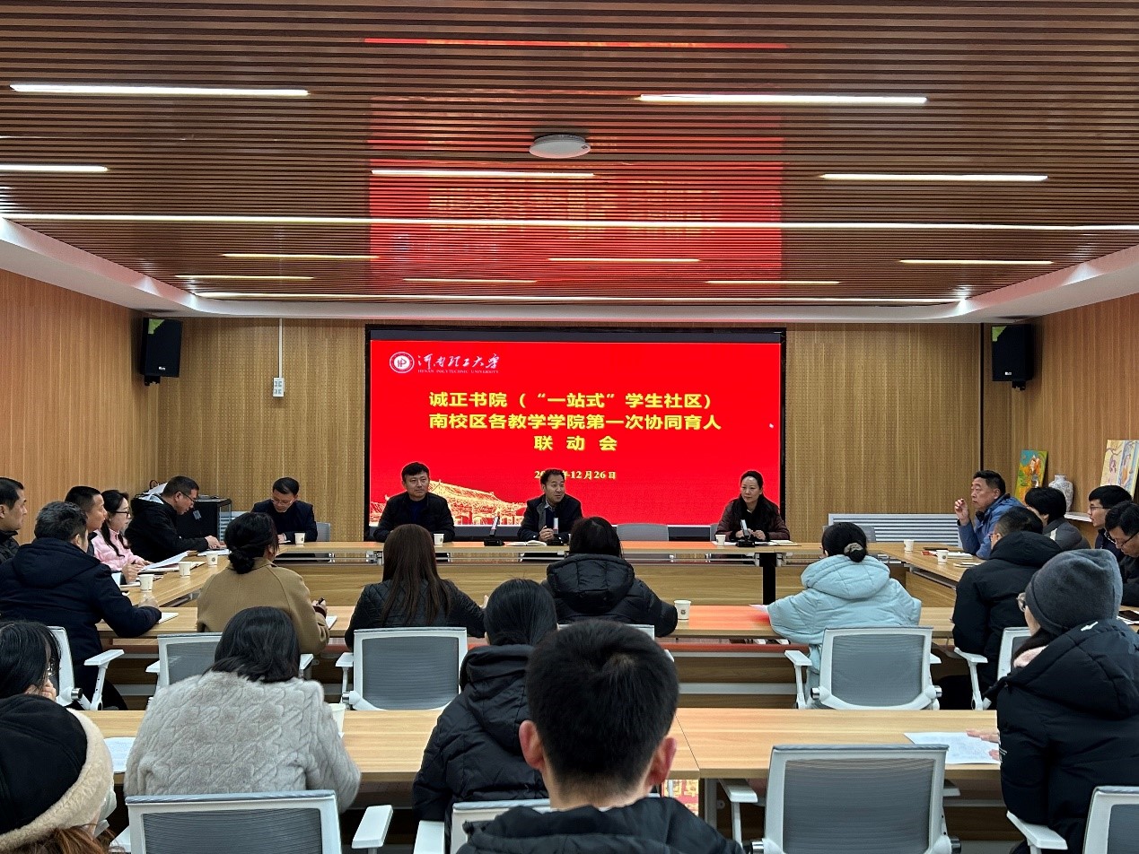 12月26日上午,诚正书院(“一站式”学生社区)与南校区各教学学院首次协同育人联动会在社区二楼会议室举行。社区相关负责人、南校区各教学学院分管学生工作副书记、联络员参加会议。会议由社区党建委副书记、管委会副主任李旭升主持。
