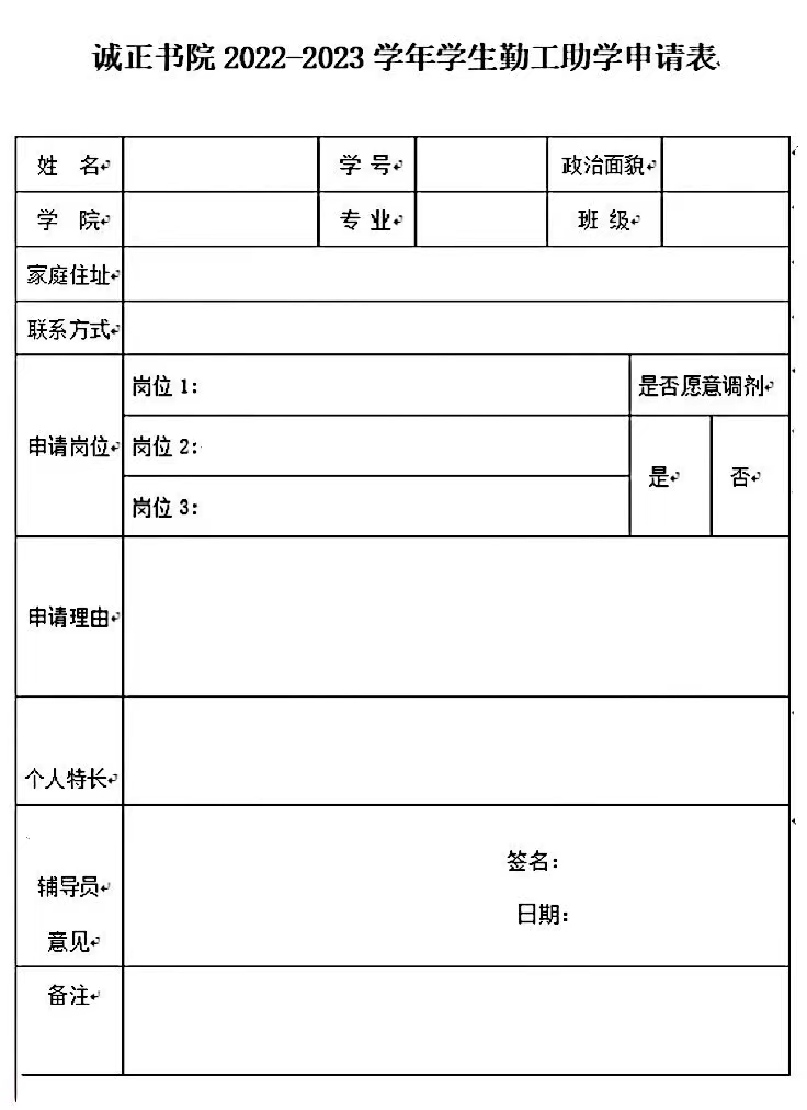 请有意愿申请勤工助学岗位的同学,填写《诚正书院2022-2023学年学生勤工助学申请表》(见附件),并将电子档于9月30前发送至邮箱:375142416@qq.com。具体面试时间书院另行通知。