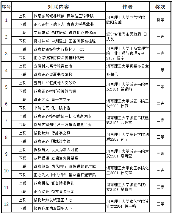 根据征集启示,结合诚正书院建设发展和核心价值理念等方面综合考虑,确定此次对联征集活动特等奖1名,一等奖3名,二等奖3名,三等奖5名,获奖结果如下: