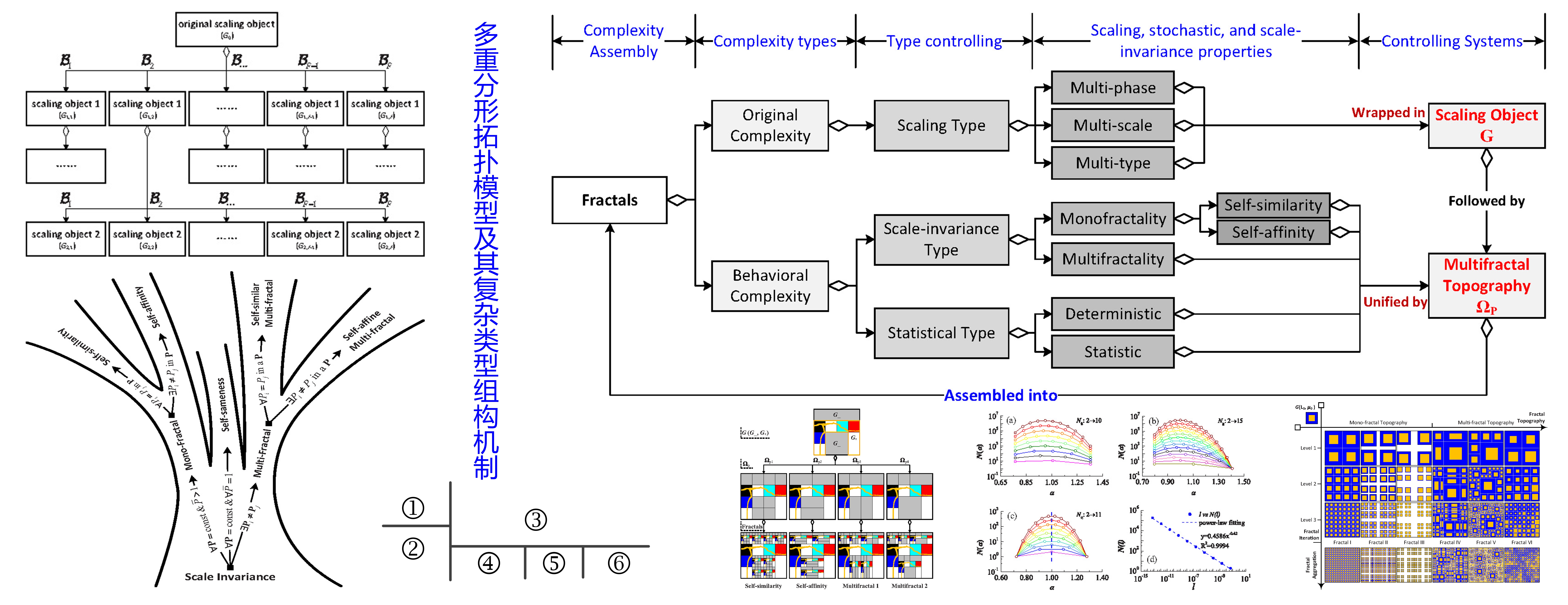 ① 多重分形行为组配模式,② 分形控制树,③ 分形对象复杂类型及其组配机制,
