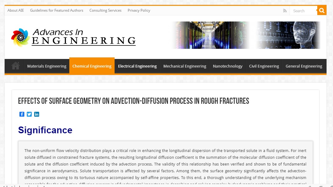 Advances in Engineering (AIE)报道原文链接:https://advanceseng.com/effects-surface-geometry-advection-diffusion-process-rough-fractures/