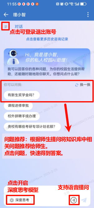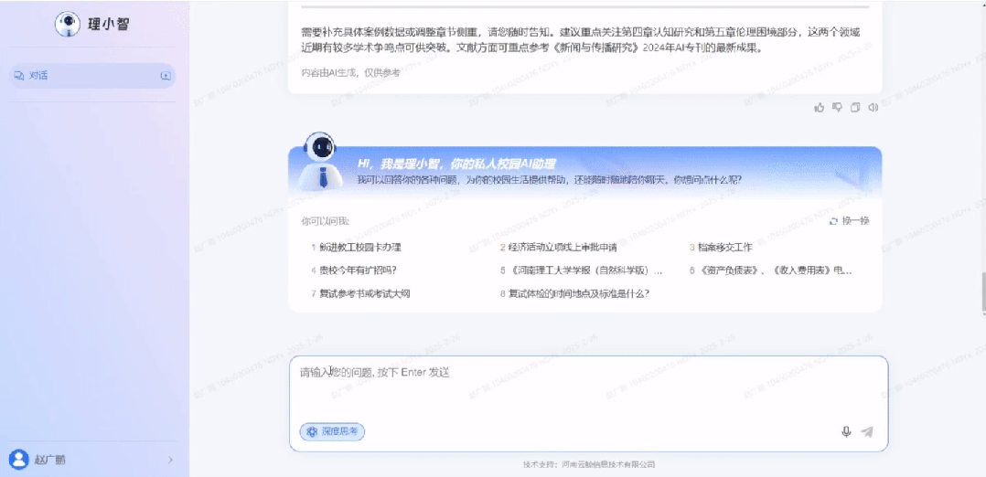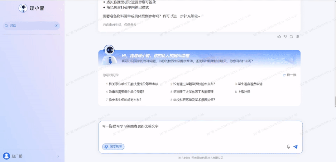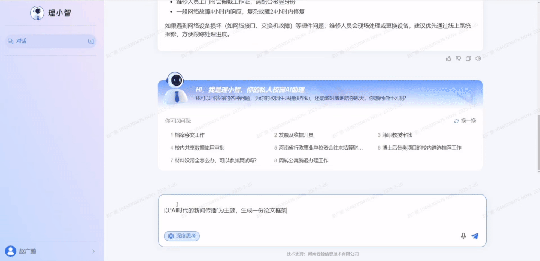 无论是校园网报修、办事流程查询,还是智慧理工系统使用指南,“理小智”均能即时解答,是师生手边的“校园百宝箱”。