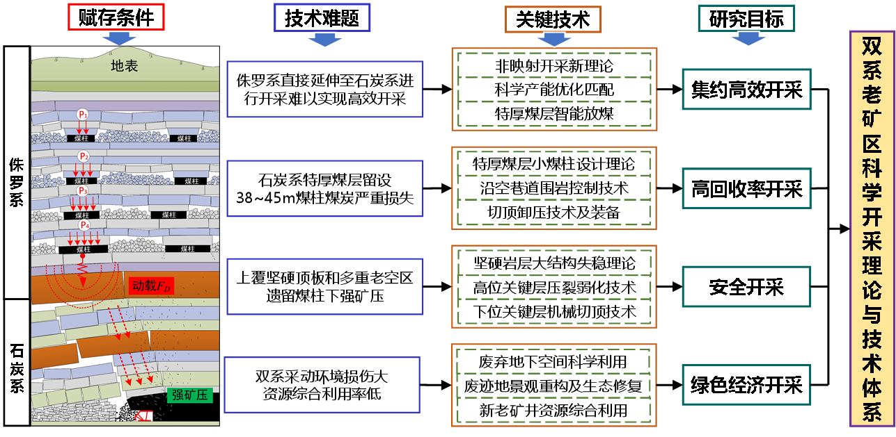 大同矿区是全国著名的老矿区,是国家资源型经济转型综改试验区的“排头兵”。大同矿区双系(侏罗系、石炭系)可采煤层多达26层,经百余年开采形成了坚硬顶板多重采空区与煤柱叠加的复杂条件,在老矿区建设千万吨级矿井集群的亿吨级现代化矿区国内外尚无先例,需要攻克老矿区集约高效、高回收率、安全与绿色经济开采等一系列重大理论与关键技术难题。在国家系列项目的支持下,经过10余年的攻关和实践,形成了老矿区科学开采理论与技术体系,建成了大同亿吨级现代化矿区。