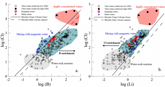 不同地热系统中元素含量对比图Cl vs B(a) 和 Cl vs Li(b)