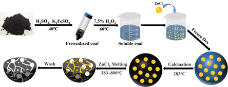 基于两步氧化法使煤可溶,以双功能可溶性盐ZnCl2作为模板剂和活化剂,制备了一系列可精确调节孔隙结构的炭材料。