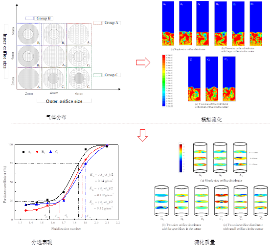 (3)明确基于二孔径布风的煤炭干选强化机制。布风板是气固分选流化床中的重要部件,直接决定了床层的布风方式。本文通过数值模拟和试验分析相结合的方式研究了二孔径布风板对流化床层的流化质量和分选表现的影响,结果如下:当布风板孔径较大(即6mm)时,床层易出现沟流现象,同时随着布风板孔径的降低,床层的压降,孔隙率以及床层密度稳定性将随之提高,而由于中心大孔对气流的重新分配导致边壁效应降低,二孔径布风板(内孔径为4mm和外孔径为2mm)将进一步提高床层的稳定(其波动方差低至径向密度的0.071 g/cm3和轴向密度的0.06 g/cm3),促进煤炭颗粒在床层的密度离析过程(灰分离析度Sash=21.62%)。最终煤炭颗粒在拥有此二孔径布风板的流化床中进行分选,精煤产品的产率为54.83%,灰分为20.96%;矸石产率为45.17%,灰分为30.77%,可能性偏差低至0.105 g/cm3,说明此条件下流化床层能达到最佳的分选效果。