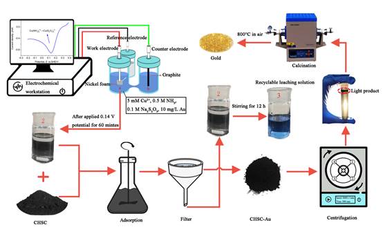(5)研究高硫煤对实际金矿浸出液中金离子的吸附性能。①CHSC在硫代硫酸盐体系中对Au(S2O3)23−具有良好的吸附效果。但在吸附液中加入Cu(II)会明显抑制CHSC对金的吸附,其原因是Cu(II)的竞争吸附以及Cu(II)的氧化作用;NH3能促进CHSC对金的吸附,但当NH3浓度高于1 mol/L时,降低了CHSC的金吸附率。 ②Cu(NH3)42+络合离子的形成不仅影响CHSC对金的吸附,还会造成吸附后的金发生脱附现象。其原因是Cu(NH3)42+络合离子会将CHSC氧化,失去对金离子的还原作用。并且Cu(NH3)42+络合离子本身是金的氧化剂,吸附后的单质金在氧化作用下再次溶解。③利用外加电压,可以使溶液中Cu(NH3)42+转化为Cu(S2O3)35−,降低溶液的氧化还原电位,从而消除Cu(NH3)42+络合离子对吸附的负面影响,改善CHSC对铜-氨-硫代硫酸盐体系中金的吸附性能。吸附后溶液,在氧气的作用下,Cu(S2O3)35−被氧化成Cu(NH3)42+,在空气中自搅拌12h后,铜氨浓度恢复为初始的80%,最大限度实现了浸出液的循环利用。④离心沉降法可用于载金高硫煤的解吸工艺,根据物质密度的差异,在离心条件为:重液密度为2.3 g/cm3,转速为2000 r/min,离心时间为8 min下可实现96.31%的金解析率。