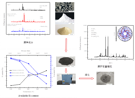 (4)构建基于高温活化技术的煤矸石基硅肥制备工艺。基于高温活化技术利用煤矸石、CaCO3以及玉米秸秆制备高效的煤矸石基硅肥,通过硅钼蓝分光光度法结合XRD以及FT-IR技术采用研究温度及混合比例对煤矸石有效硅溢出率的影响及活化机理。结果显示:当煅烧温度达到600℃后,煤矸石的层状结构受到了重大破坏,高岭石开始向偏高岭土等其他物质转变,但煤矸石中有效硅溢出率不高(低于10%);在单独添加CaCO3后,煤矸石中石英及白云母有关的峰强度随CaCO3含量的增加明显下降,但由于CaCO3在整个煅烧活化过程中主要起到了催化作用,仅在与煤矸石接触表面形成了较少的硅酸钙,有效硅溢出率仍处于12.60%以下;而单独添加玉米秸秆后,由于玉米秸秆煅烧后的氧化物参与了煤矸石煅烧过程中的化学反应,形成了霞石(K(Na,K)3Al4Si4O16)等硅酸盐,其有效硅的溢出率要明显优于CaCO3。当煤矸石、CaCO3以及玉米秸秆混合煅烧时,在CaCO3以及玉米秸秆的协同作用下,煤矸石中有效硅溢出率可高达22.97%,有害重金属浓度均低于0.025mg/L,符合农业硅肥的安全性要求,实现了煤矸石硅肥的高效制备。