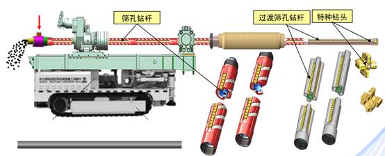 2)在试制多种盾护卸压钻具的同时,开展了大量实验和理论研究。通过力学分析探讨了盾护卸压钻具的筛孔进渣过程和内孔排渣过程。通过开展进渣物理模拟试验和进渣气固耦合数值模拟,探究了影响盾护卸压钻具筛孔进渣的因素及其影响规律。通过开展排渣物理模拟试验和排渣气固耦合数值模拟,探究了影响盾护卸压钻具内孔排渣的因素及其影响规律。通过数值模拟及理论计算分析了盾护卸压钻杆的强度,发现筛孔直径、筛孔间距及轴向槽深度是影响钻杆强度的关键参数,筛孔、轴向槽、螺旋槽交汇处钻杆受力最大。