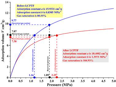 (2)开展了CO2相变致裂对煤吸附特性研究,揭示了CO2相变致裂后,煤对甲烷的吸附能力减弱,解吸能力增强(图2);提出了一种基于含气饱和度和临界解吸压力的变化的CO2相变致裂效果评价方法(图3)。相关研究成果发表于《Energy & Fuels》。此项研究为项目研究开展CO2相变致裂区煤体动力学特征和瓦斯运移特征提供技术支撑和方法借鉴。