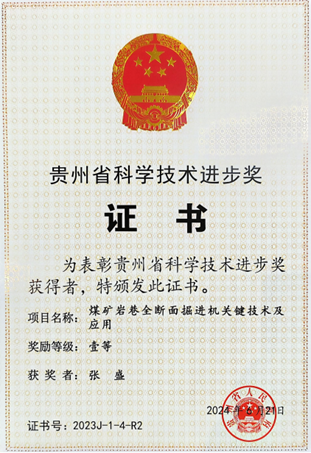 以张盛教授为核心的“深部岩体力学与工程应用创新团队”与中铁工程装备集团有限公司、贵州贵能投资股份有限公司、平顶山天安煤业股份有限公司等单位开展校企联合攻关,针对煤矿超前地质探测难、复杂工况装备适应难、复杂地质条件掘进难等问题开展研究,创立了“物探+钻探+岩体感知”超前地质探测实时智能感知系统、研发了适应复杂工况的TBM智能装备及集成技术、构建了应用于煤矿复杂地质条件TBM快速施工技术体系,实现了煤矿TBM最小转弯半径60m、最大下山坡度-16°、最大岩巷月掘进速度623m等一系列突破性科研成果,在多个煤矿进行了成功应用。该团队相关研究成果获得2023年度贵州省科学技术进步奖一等奖。