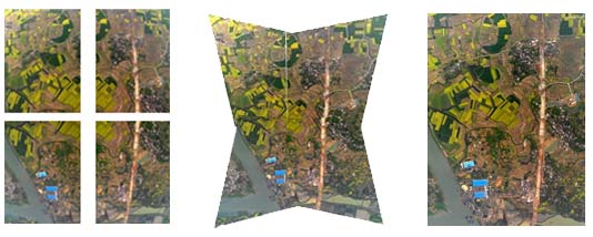 (2) 创立了多中心投影影像单中心化和五分之一像元级的影像拼接技术。
