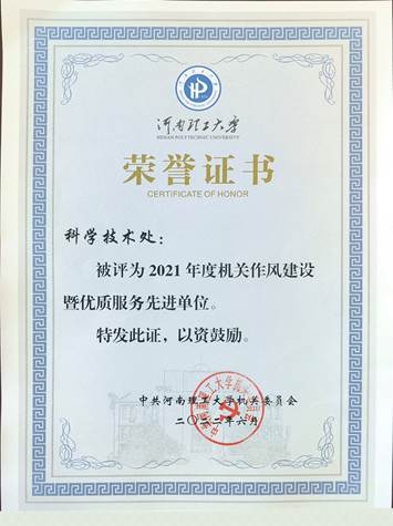 近日,科技处荣获“2021年度机关作风建设暨优质服务先进单位”荣誉称号。