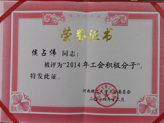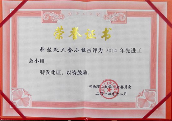 正是由于我处职工在各类工会活动中的优异表现,用行动诠释出“健康生活、快乐工作,健身、工作两促进,我为祖国奋斗五十年!”的人生态度,在2014年科技处工会小组被评为“河南理工大学优秀工会小组”,侯占伟、彭红星、张波被评为“河南理工大学工会积极分子”。这是给科技处全体职工的荣誉,更是对我们在2015年争取更好成绩的激励。