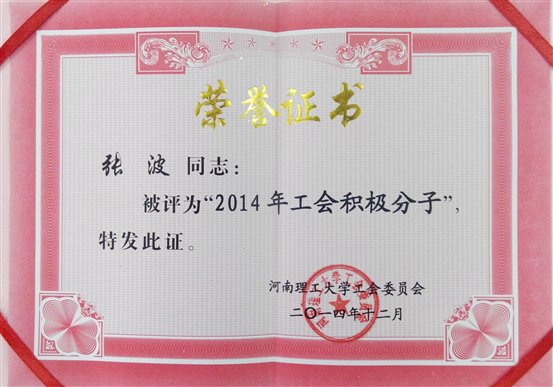 9、张波积极参加校工会5月份组织的《河南理工大学关于做好2014年师德主题演讲比赛及征文活动的通知》征文活动,投稿一篇《教书育人—师之本色》,荣获二等奖。