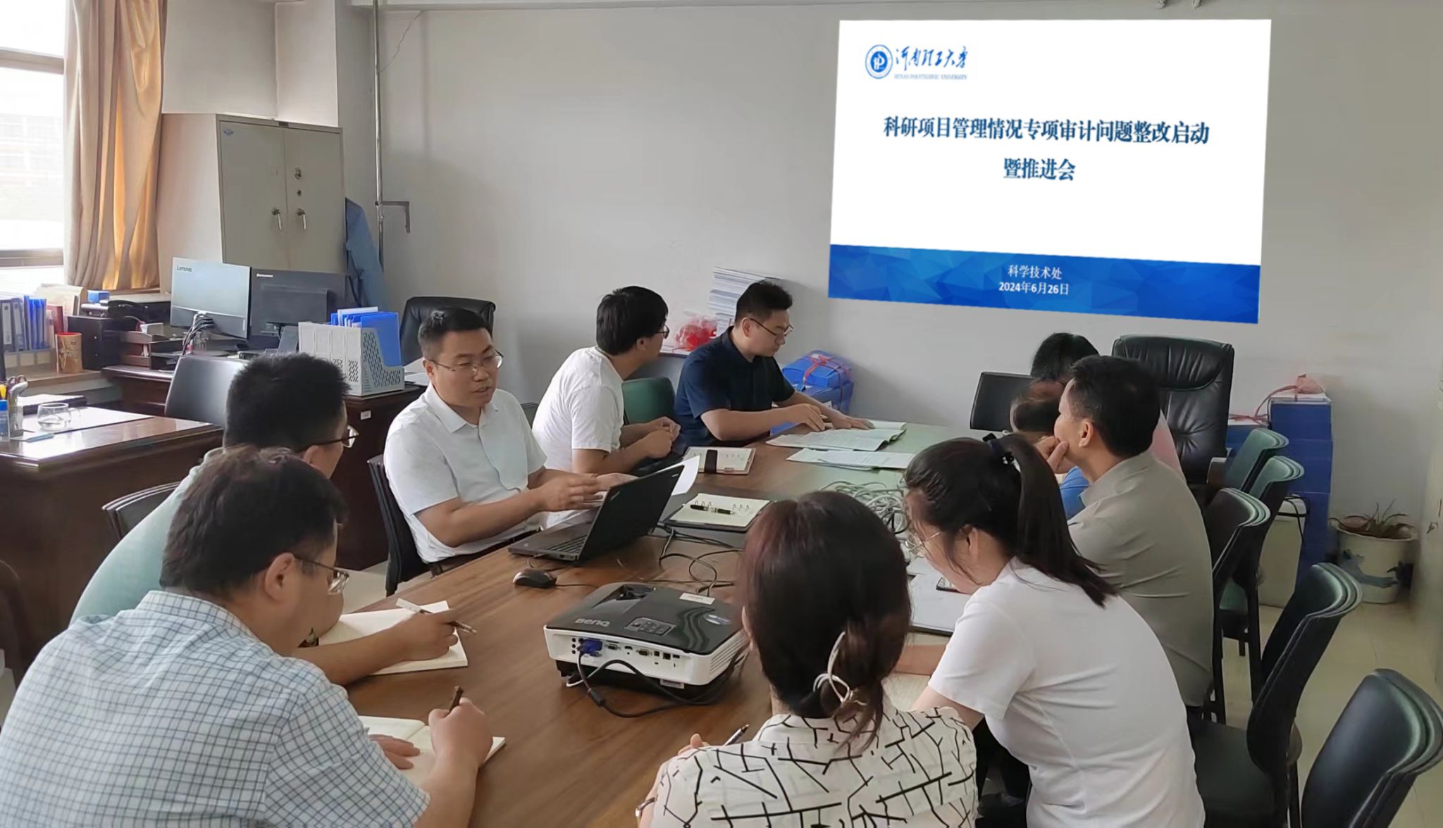 6月26日上午,科技处在力行楼326房间组织召开科研项目管理情况专项审计问题整改启动暨推进会。会议由科技处处长陈向军主持,副处长王兴国、张宝庆、谭毅及相关科室负责同志参加会议。