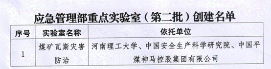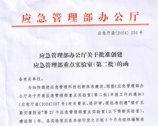 近日,应急管理部办公厅发布了《应急管理部办公厅关于批准创建应急管理部重点实验室(第二批)的函》(应急厅函〔2024〕256号)。由我校作为牵头单位,中国安全生产科学研究院、中国平煤神马控股集团有限公司联合申报的“煤矿瓦斯灾害防治”应急管理部重点实验室成功获批创建。