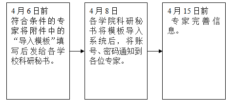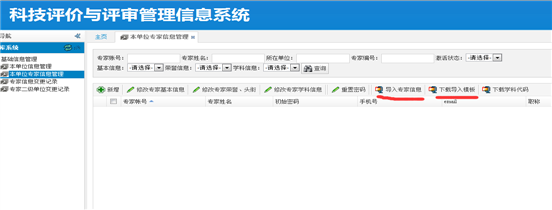 3、各学院秘书下载“导入模板”,请符合条件并有意申报的老师填写“导入专家信息模板”,学院汇总后导入系统,系统自动为每位专家分配账号、密码。如下图处: