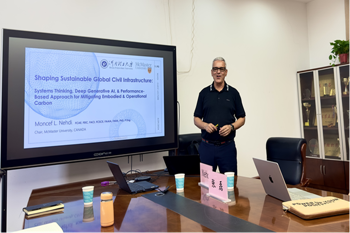 本网讯(通讯员 王俊波)6月29日上午,应土木学院邀请,加拿大工程院院士、加拿大麦克马斯特大学工学部部长蒙瑟夫·奈迪为该院师生作了题为《塑造可持续的全球民用基础设施:运用系统思维、深度生成AI及基于全生命周期绩效评估的建筑降碳方法》(Shaping Sustainable Global Civil Infrastructure: A Systems Thinking Deep Generative Al, and Performance-Based Approach for Mitigating Embodied and Operational Carbon)的学术报告。报告由该院副院长余永强主持。