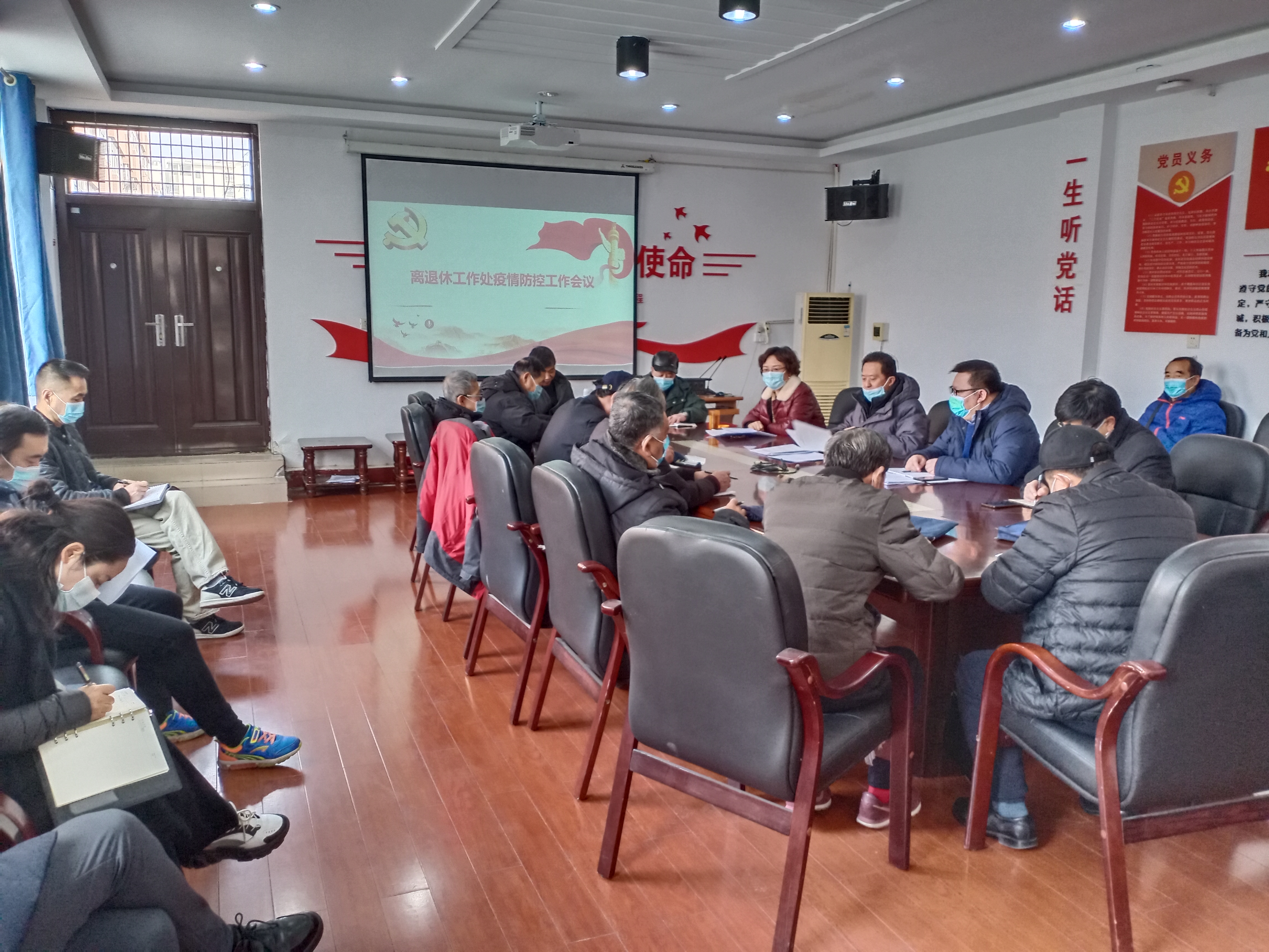1月13日下午,离退休工作处在活动中心三楼会议室召开寒假期间疫情防控工作会议。离退休职工党支部书记和全体在职职工参加会议,会议由处长杨可臣主持。