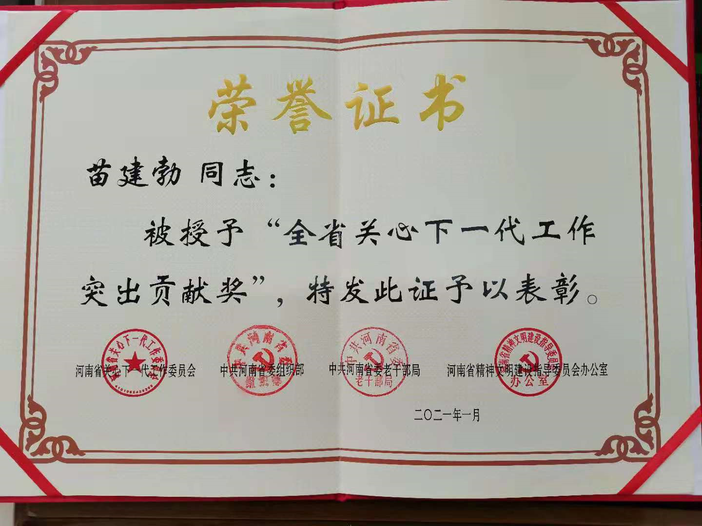 近日,河南省关心下一代工作委员会、中共河南省委组织部、中共河南省委老干部局、河南省精神文明建设指导委员会办公室联合印发文件,对全省关心下一代工作先进集体和先进个人进行表彰。我校关工委副主任委员苗建勃荣获“河南省关心下一代工作突出贡献奖”。