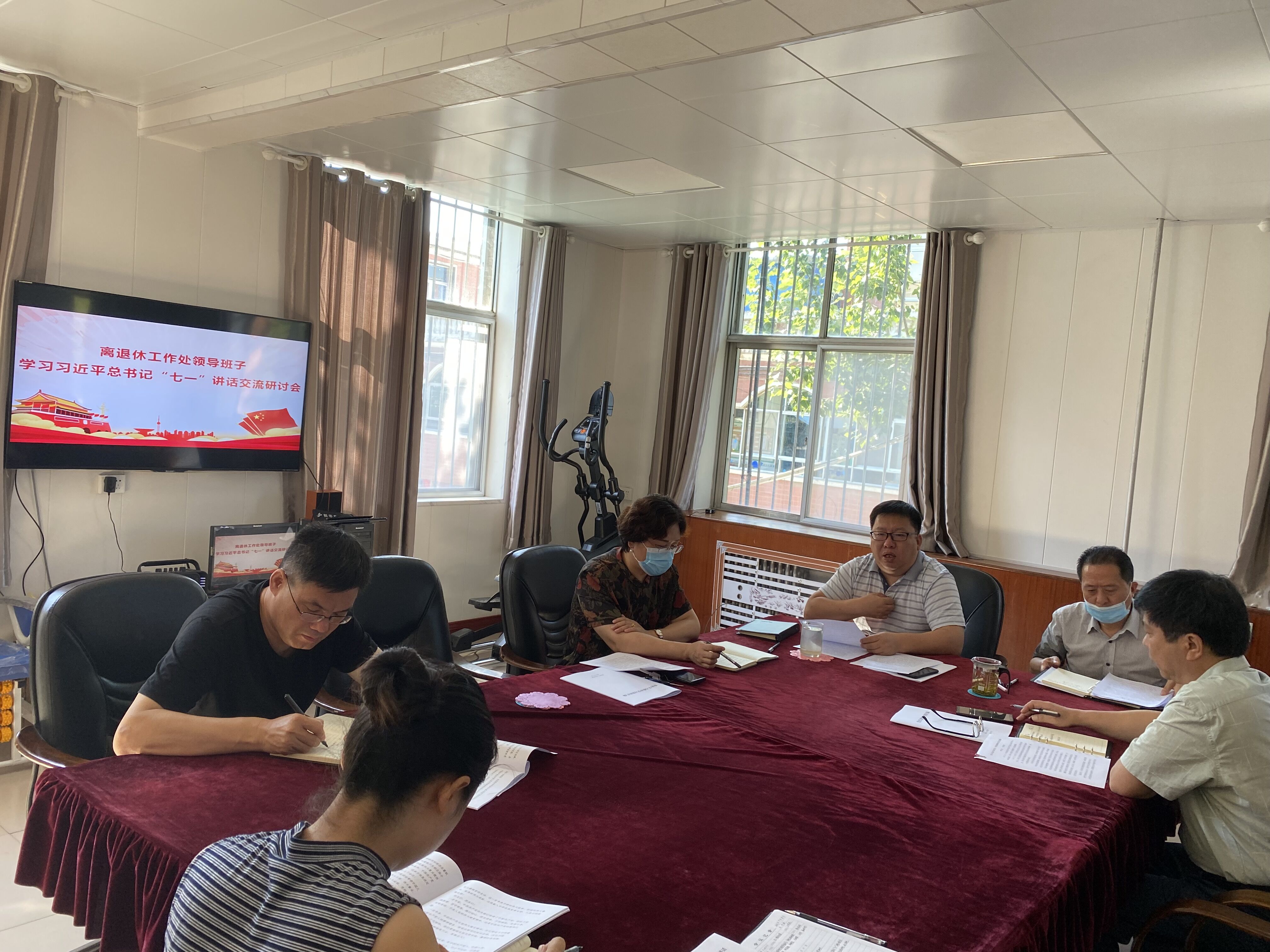 7月8日上午,离退休工作处党委在二楼会议室召开专题会议学习习近平总书记“七一”重要讲话精神。处领导班子成员、在职职工党员参加会议,处党委书记王建州主持会议。