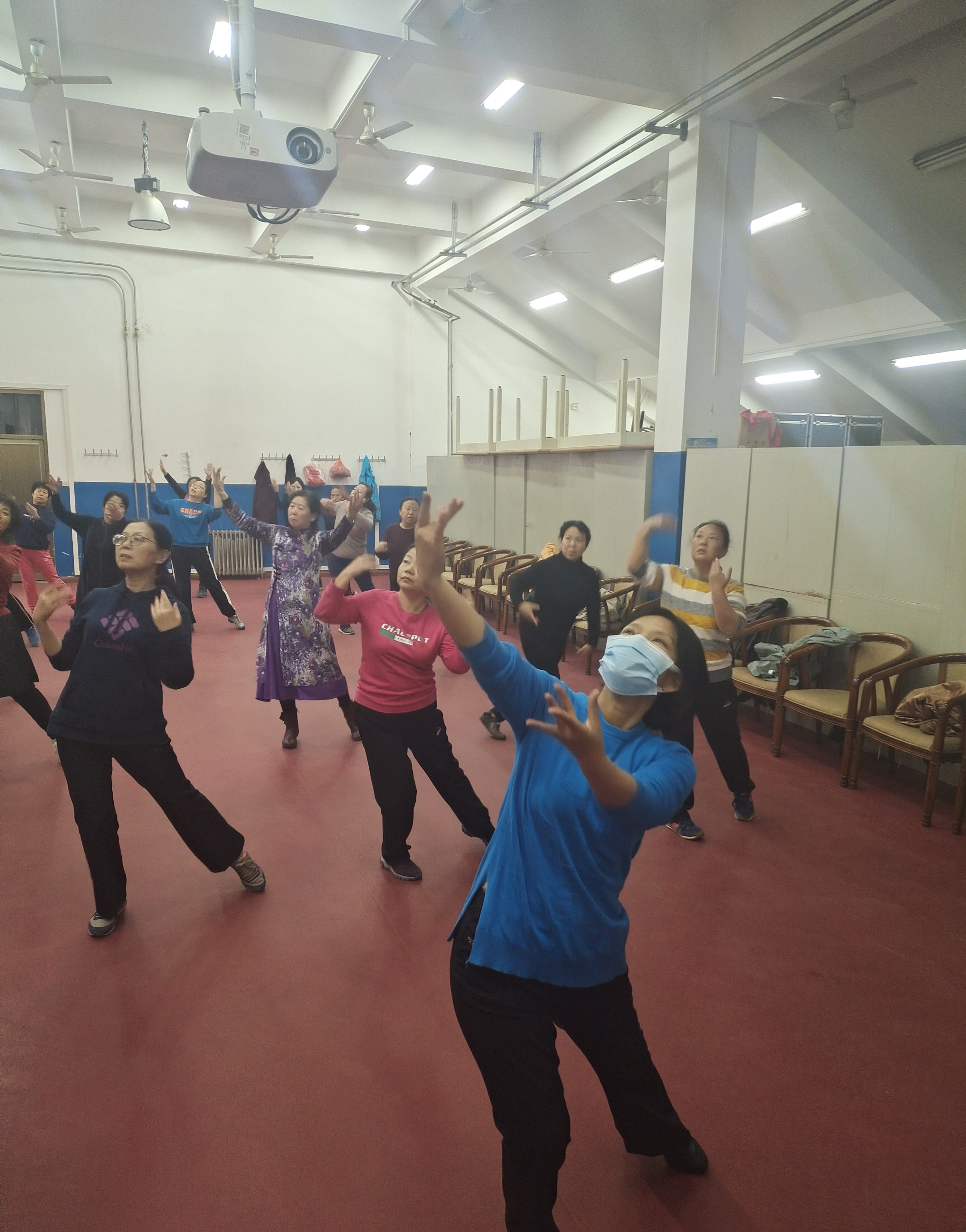 舞蹈班培训内容为老年形体训练、中国民族舞和当下几支热门的广场舞,培训班特邀艺术系舞蹈专业刚退休的吴丹老师担任主讲。在吴老师的指导下,学员们合着美妙的音乐、舒展着双臂,扭动着腰肢,认真地练习一些舞蹈动作。授课之余,由侯爱民老师带领大家排练舞蹈节目,气氛热烈欢快。