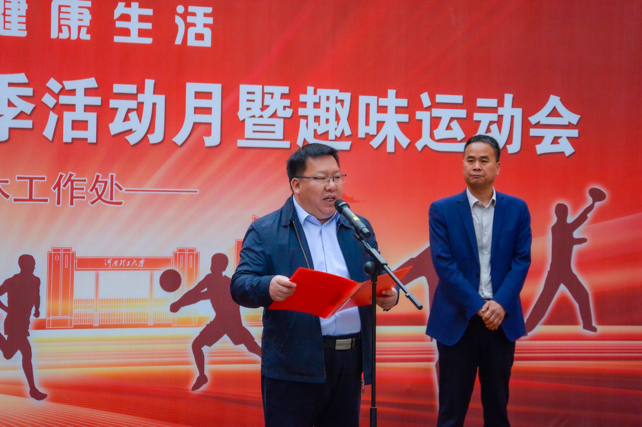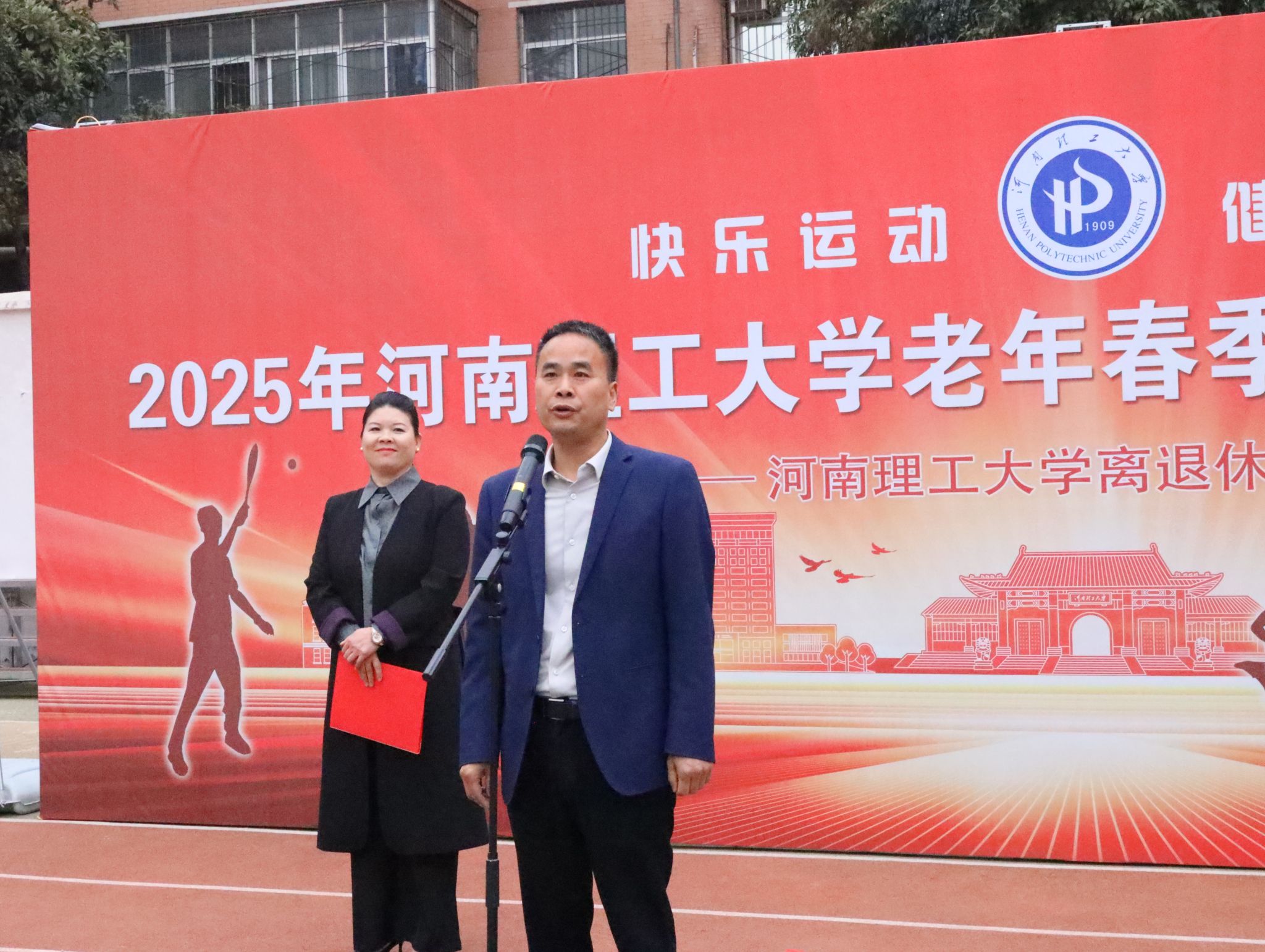 离退休工作处党委书记王瑞宣布2025年河南理工大学老年春季活动月暨趣味运动会开幕。