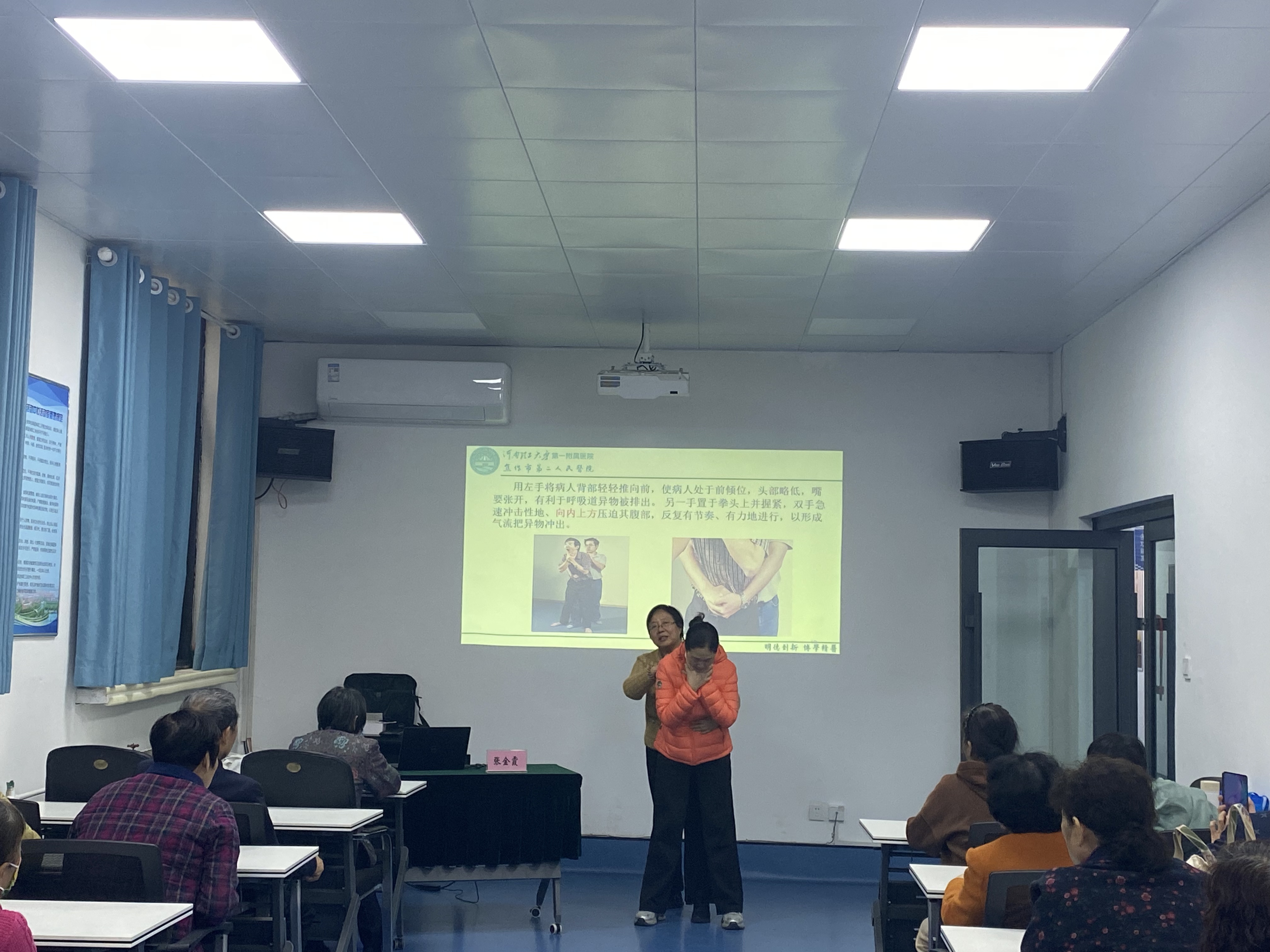 讲座现场,张主任以“退休不‘退’健康”为题,用通俗易懂的语言,结合丰富的临床案例,围绕全生命周期健康管理理念,从日常饮食、运动锻炼、心理健康等多个方面,详细讲解了适合离退休老同志的健康生活方式。在急救知识讲解环节,通过现场演示和互动教学,系统地介绍了心肺复苏、海姆立克急救法、骨折固定等实用急救技能。张主任一边操作,一边详细讲解每个步骤的动作要领和注意事项,如心肺复苏时的按压位置、频率、深度,海姆立克急救法在不同年龄段人群中的使用区别等。生动的讲解和直观的演示,让在场的老同志快速掌握了急救技能,现场学习氛围浓厚。